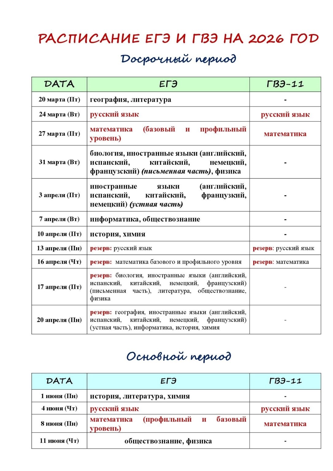 Расписание ГВЭ-9 и ГВЭ-11 2026 г.